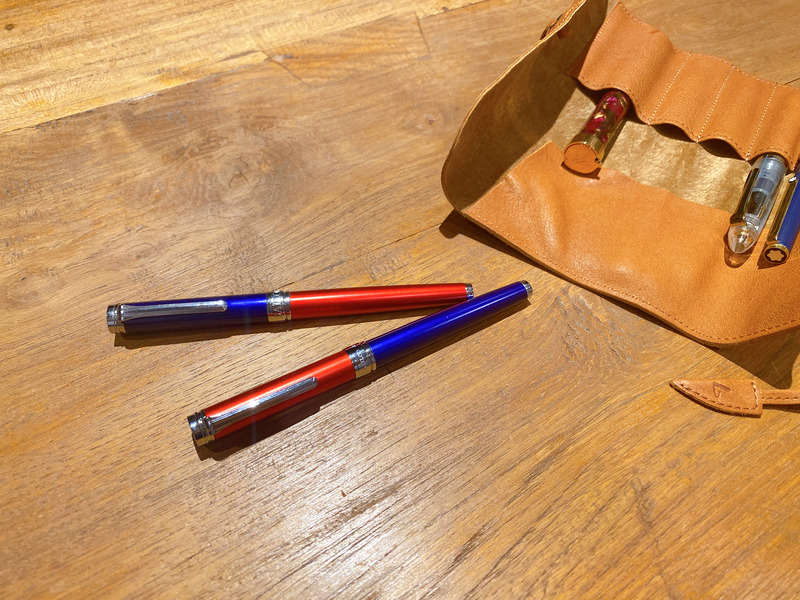 赤と青の万年筆のキャップを交換すると一気に雰囲気が変わります!