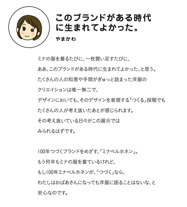 ★星野注:やまかわさんは、ミナペルホネンがとても好き。ちょっと前のものですが、やまかわさんがミナペルホネンの展示会について書いた文章がとてもすてきだったので、ここに貼り付けます。