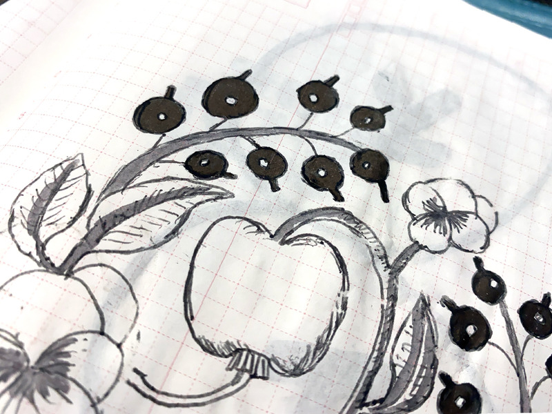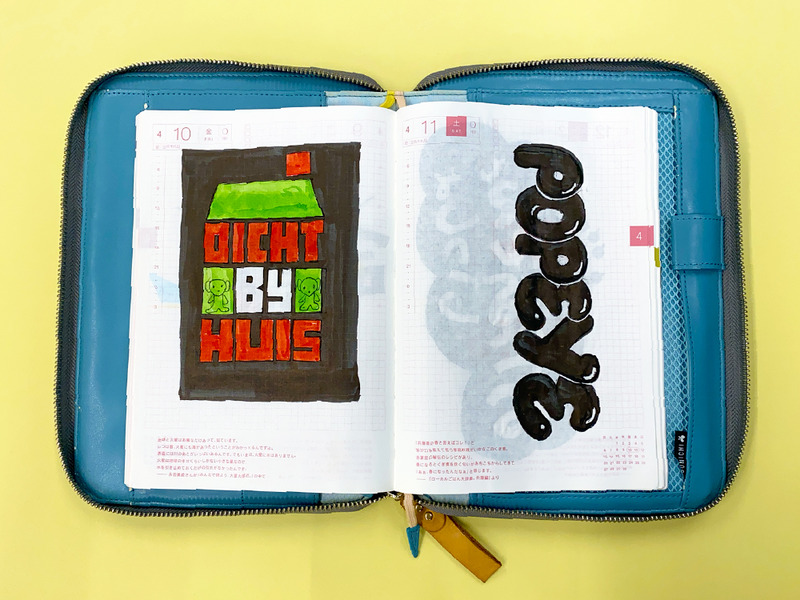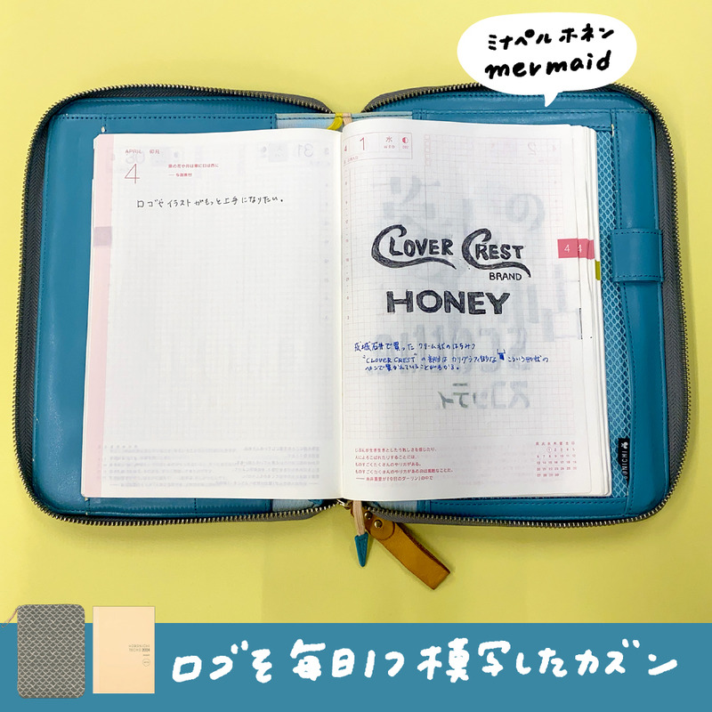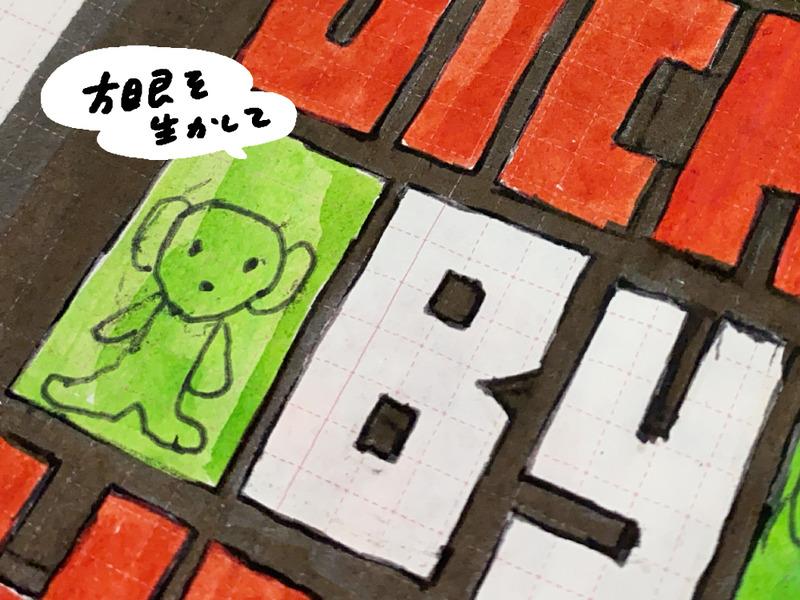 ▲方眼を生かしたり、色を塗ったり、カズンサイズの大きな紙面いっぱいに描かれたロゴが目に楽しい。