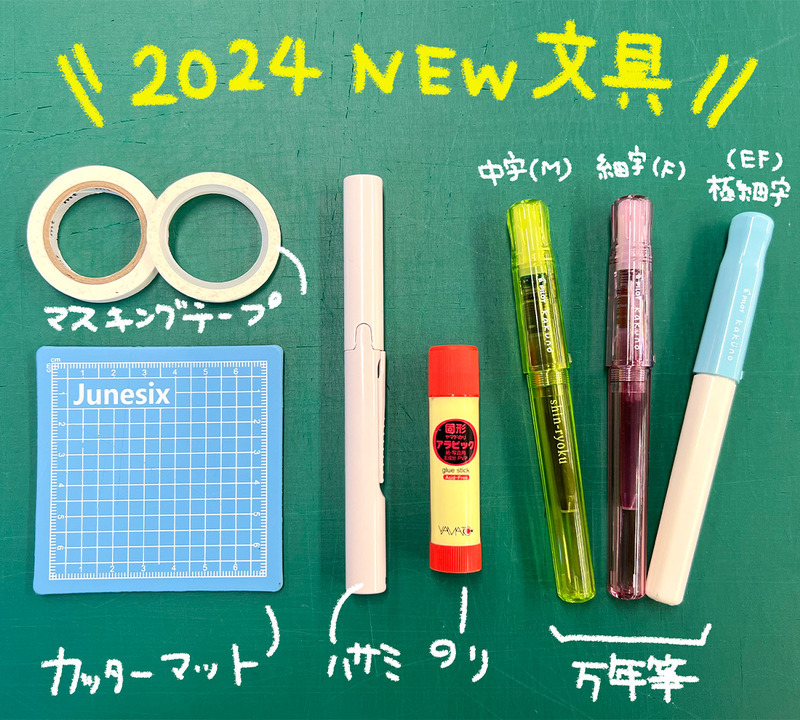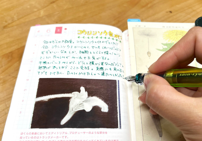 万年筆初心者のわたしは、使い捨てカートリッジタイプのインクで色々試しています。上の写真では kakuno(中字)に PILOT 色彩雫【深緑】をセット!