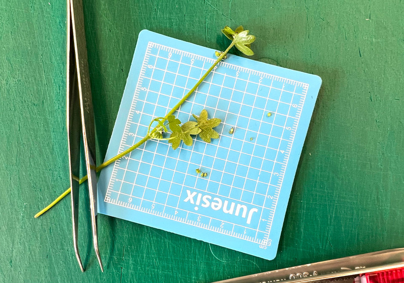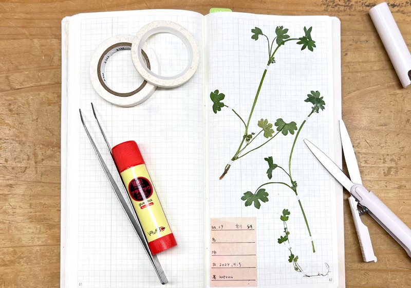 my標本。アラビックヤマトは粘着力がやさしくサラリと乾きやすいので、手帳に直接のりを塗って草を置き、乾けば閉じてもくっつきにくいです。mtの3mmは標本を固定するのにちょうどいい細さ!
