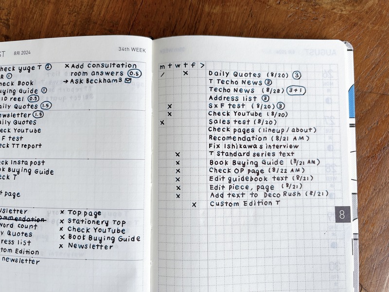 ▲右ページ。上のアルファベットは曜日の頭文字。最後の>は次の週に繰り越すもの。