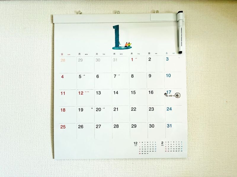 2026年のカレンダーが届いてすぐ、家族の予定が書き込まれていました。