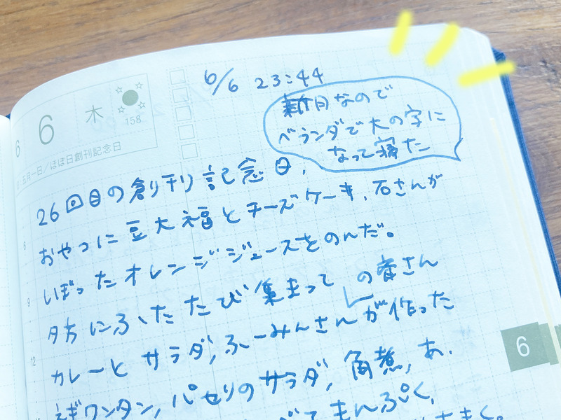 Here Ifve written gI layed on my back in the veranda because it was a new moon.h This day was Hobonichifs anniversary, and because I had spent such a fun day Ifd already written quite a lot for my diary entry, but I still felt like I should write this down as well.