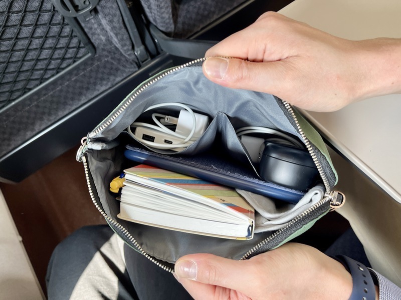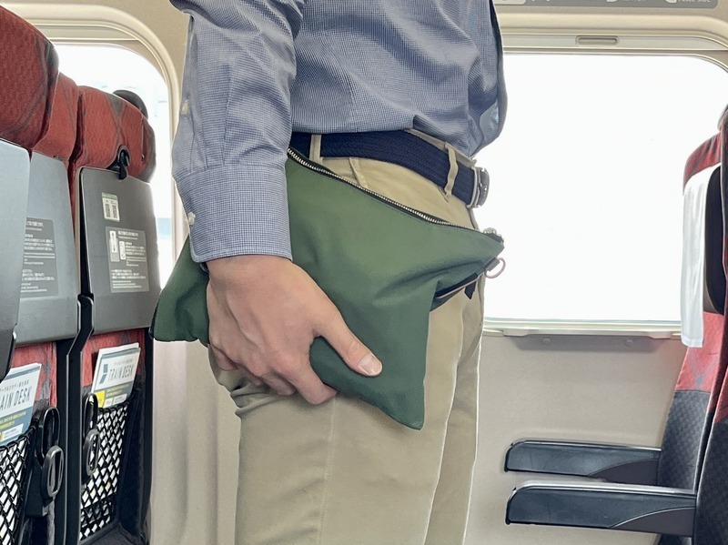 When he travels for work or goes on trips, he says the first thing he does after taking his seat on a train or plane is pull the Tragen Flat Pouch out of his bag and slip it into the pocket in front of him [ just like this.