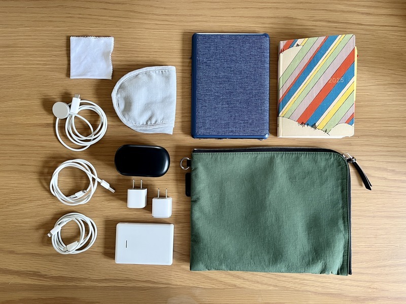 In the smaller pocket: a glasses cloth, earbuds, a mobile battery, a phone charging cable, and an Apple Watch charger.