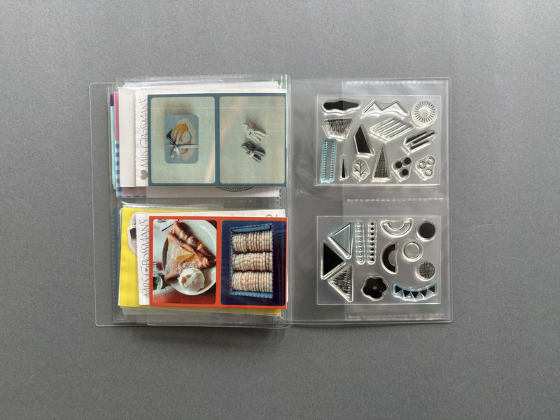And on the right?clear stamps! One of our crew members had them stored in a different card case and I thought, gThatfs perfect!h so I copied the idea. If you fill all the pockets, itfll get thick, but itfs great for carrying around one or two favorites.
