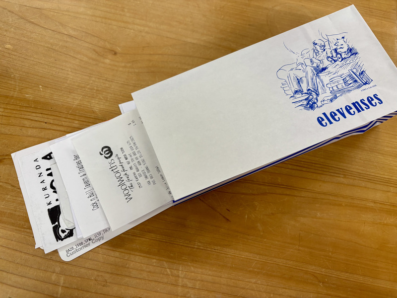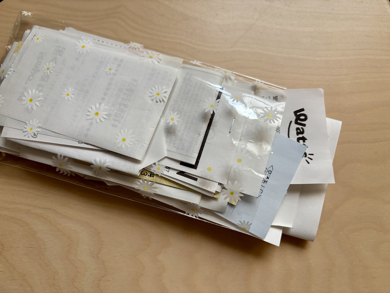 (I used to have a phase where Ifd just toss receipts and packages I wanted to paste later onto the table... and before I knew it, I had a whole monthfs worth piling up and felt overwhelmed. But if you decide, gIfll keep everything in this album,h it feels easier to keep up with things.)