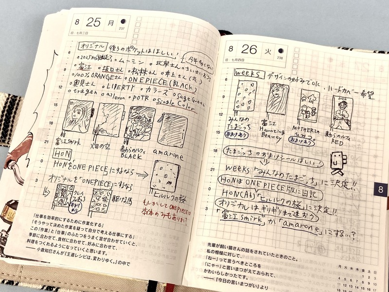When I appeared on the Hobonichi Techo pre-release live video on YouTube, I was still unsure. Should I go with the Hiroko Kubota design, One Piece, or give up on a HON altogether and use the Moomin Graph Notebook?