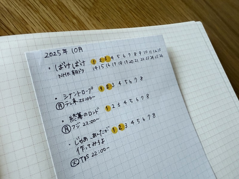 On the following pages, Ifll draw each dramafs title logo and record my impressions. With the release of the Hobonichi Techo App (available in Japan since October 15), I now jot down my thoughts right after watching an episode. By tagging each entry with the dramafs title, itfs easy to look back later when transferring notes into my techo.