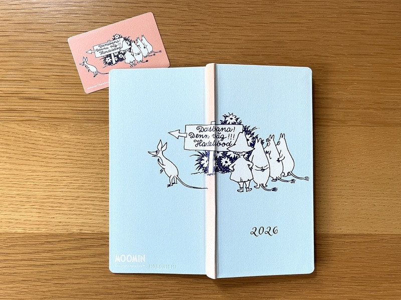 And as for the gTo the Outdoor Dance Hallh design, I just love the round little shapes of the charactersf behinds! That soft curve is what makes Moomins so endearing, donft you think? The pale blue background and light orange spine are also such beautiful colors. Ifm really looking forward to spending my workdays in 2026 with Moomin by my side.