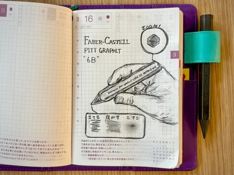 The hardness of this pencil is g6B.h Ifve only ever used up to 4B before, so even just the number g6Bh alone got me excited. Perhaps 6B is common for those who do sketches, but isnft there a sense of romance in owning something "over-spec" that youfd never normally use in daily life?
