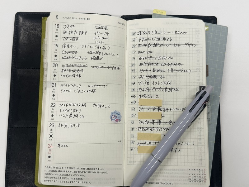 By the way, this very plain techo is written mostly with a Frixion Synergy Knock 03. This year was my Weeks debut, and I wanted to write and draw with a very fine line. Since itfs even thinner than the 0.38mm pen I used before, I gave it a try—and now itfs a favorite.