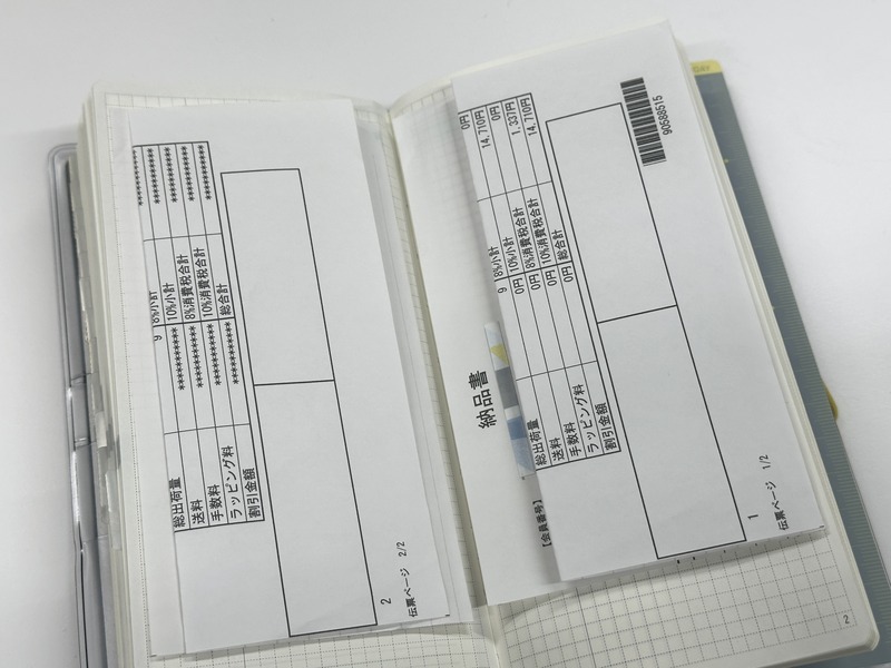 Shop cards and flyers tend to pile up after events. This year, I decided to paste all of them into my techo. One great thing about the Avec is that it can handle a lot of bulk. On the right-hand page here, I had pasted a total of seven shop cards. Just sticking them in like this is enough to bring back memories of the day, which I really like.
