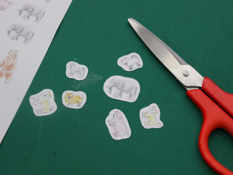 He lines up the scanned animals once shrinking them down in size, and prints them out on an A4 sized printable sticker paper. (Iwakuro used the A-one label seal in Matte white.)