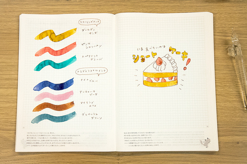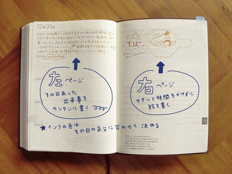 She writes her day's events on the left page, and draws a quick illustration on the right. She used to only write on the left page, but ever since switching to using a glass pen, she felt the urge to write more and decided to draw on the right page! She occasionally uses a brush to color in her drawings too. Annen says that the time spent in choosing an ink color of her choice is a fun one.