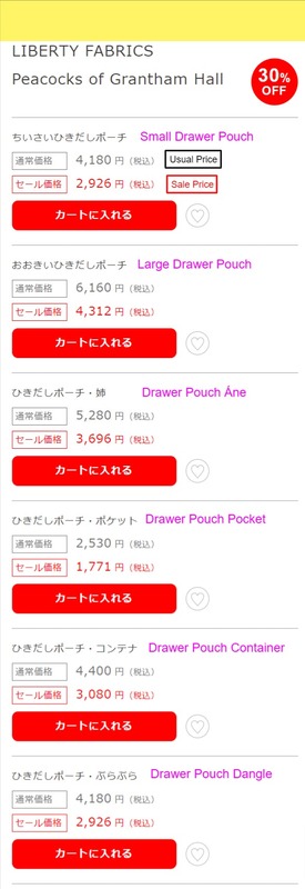 The Drawer Pouches on this page are assorted by the type of textile. For example, all the Liberty Fabrics: Peacock of Grantham Hall pouches, from the Small Drawer Pouch to the Drawer Pouch Container, are gathered into one page, so no matter which size you click on, if it's the same textile, it will lead to the same page.