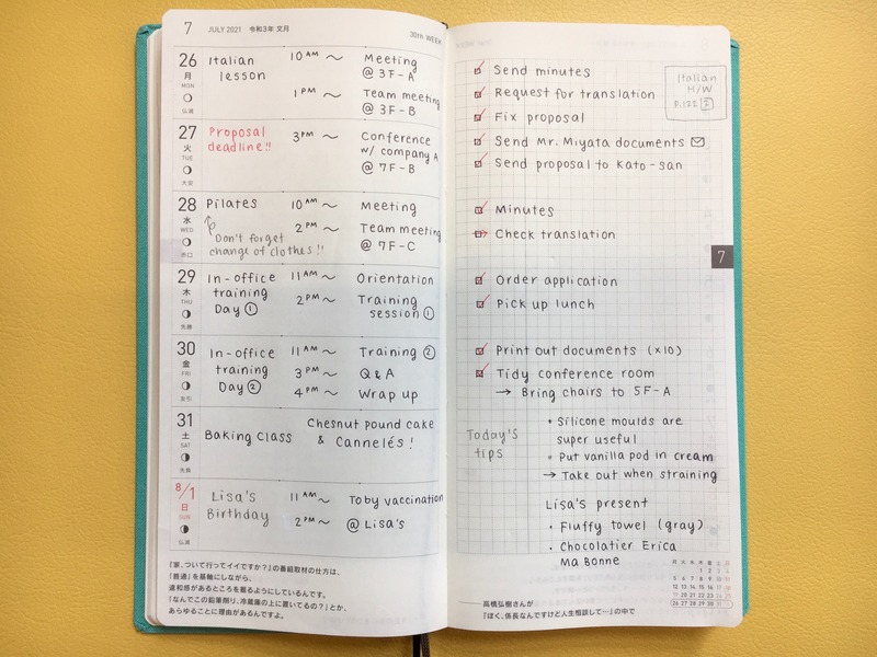 I started out by using a 3-color Jetstream ballpoint pen to fill in my techo. I write down the weekly schedule at the start of the week on the left-hand side, and add the to-do check boxes on the right side as the week progresses. Although it looks clean, I do want to add a bit more color.