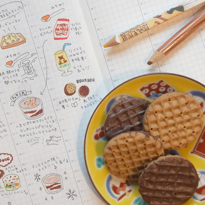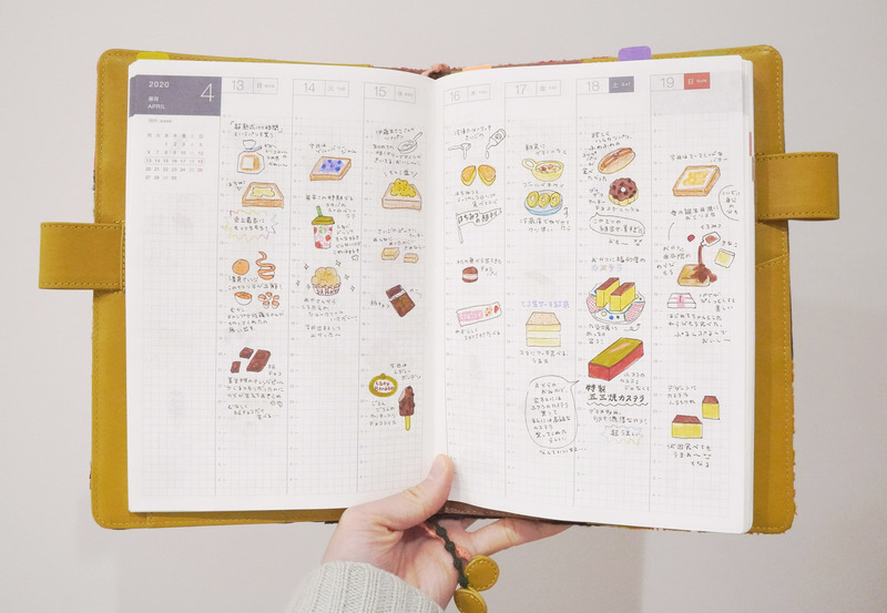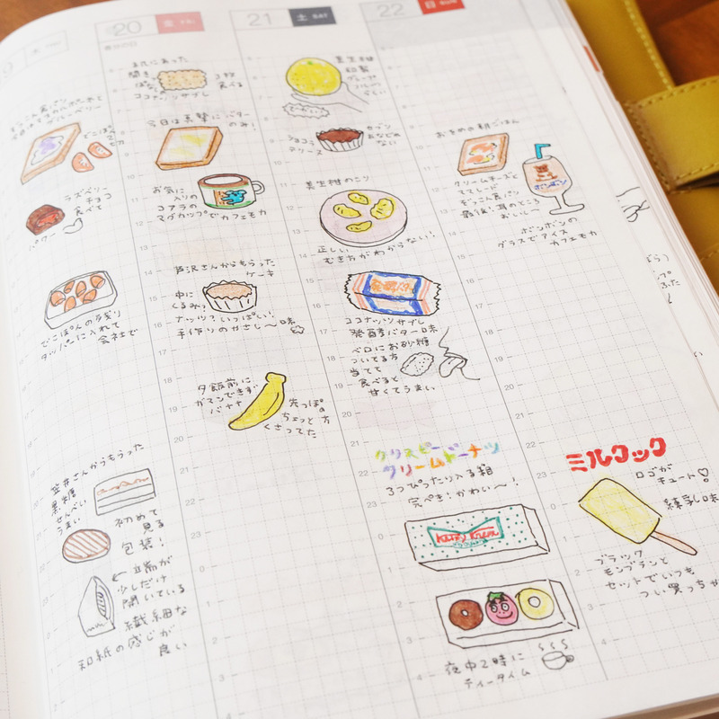 Before, she often took photos of the snacks on her smartphone, but by actually writing and drawing it down in her techo, she finds it more fun to look back on and last in her memory better.