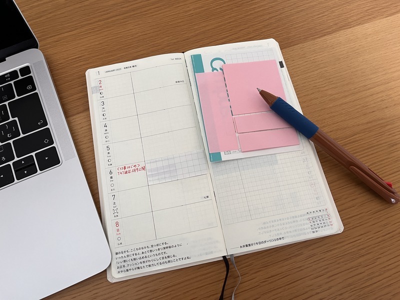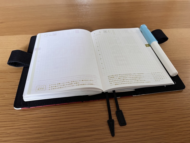 Whatfs good about the Hobonichi Techo is that although it is thick, it can still be easily opened 180 degrees, making it easy to write on. I also like the fact that I can keep it open without having to hold it down with my hand, which makes it easy to write and also easy to read what I have written.
