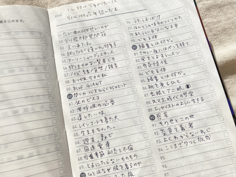 I used No. 1-50 to write down my bucket list, and 51-100 to write down the books I read