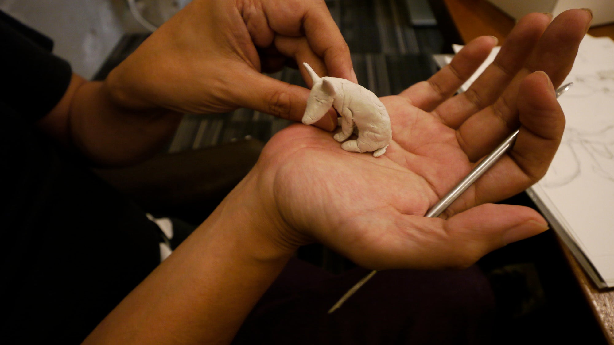 海洋堂の松村しのぶさんが、ブイちゃんを見ながらねんどでつくってます。