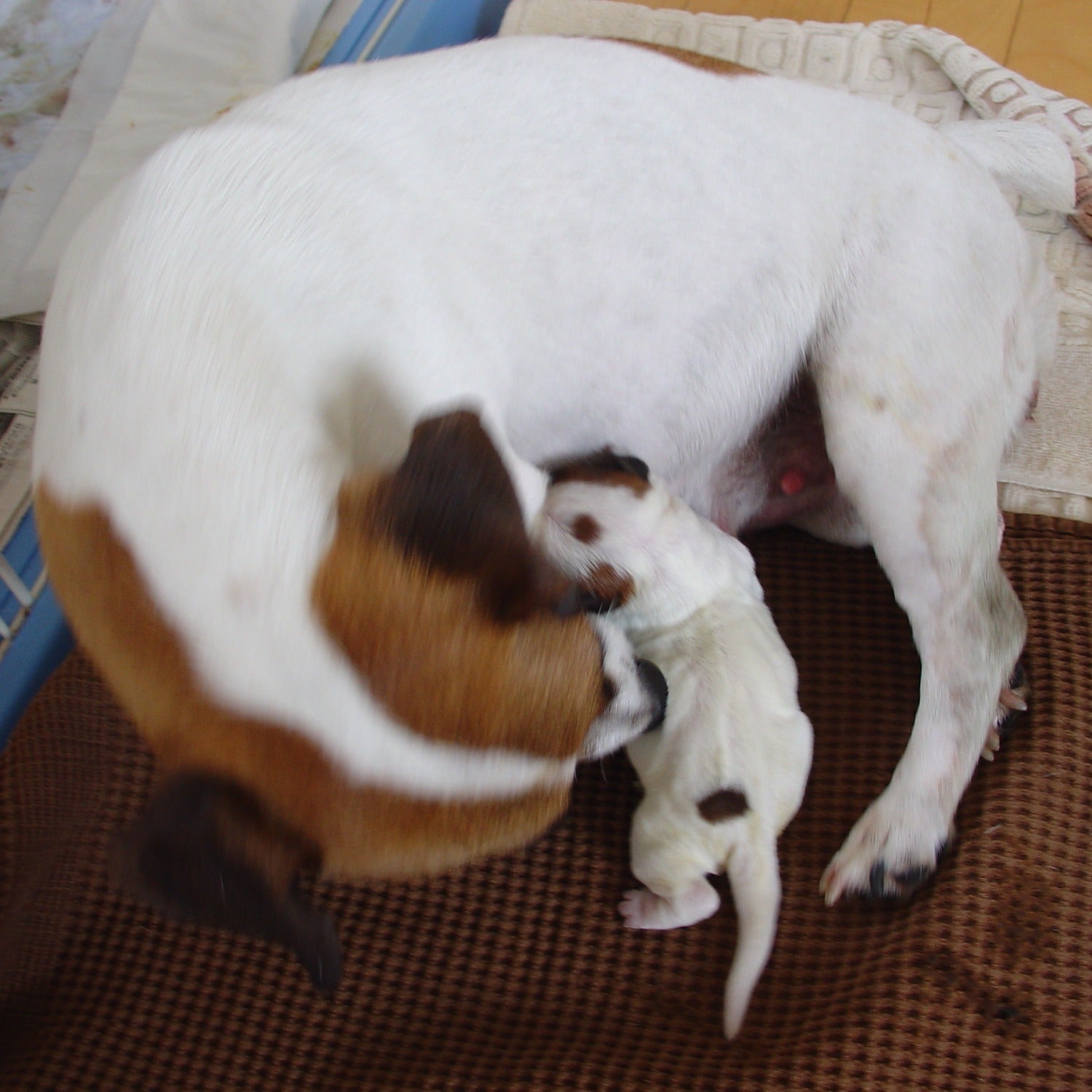今まで、どこにも公開してなかった、ブイヨン(ニコ)のほんとの最初の写真です。まだサンコ、ヨンコはお腹の中にいて、おっぱいひとりじめ。そのあとすぐに、奪い合いになったんですけどね。この時のうれしさは、今でも忘れません。
