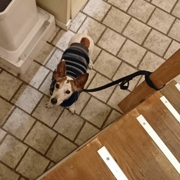 昨年12月のこと。TOBICHI2に行ったら糸井さんとお会いすることができました。糸井さんに「ブイちゃんは?」とたずねたら「下にしばってきたんだ」と。下に降りてみると、ホントだホントだブイちゃんだ!こんにちはー。私たちもわんこを連れていたので、ブイちゃんとの感動のご対面でした。