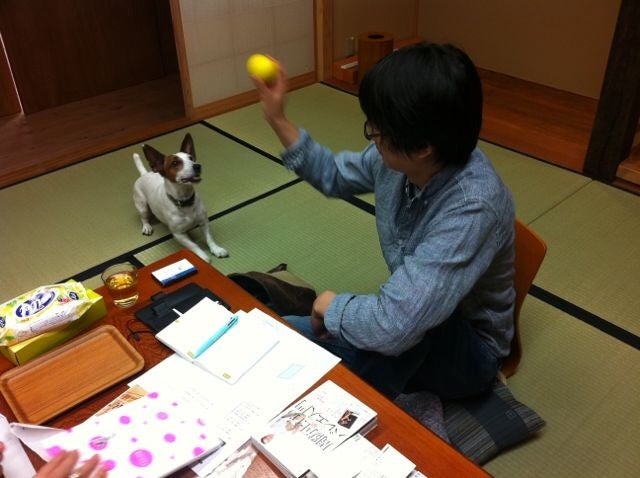 2011年、和室での打ち合わせ中の写真です。ボールが大好きなブイヨン、あそんでくれてありがとう。
