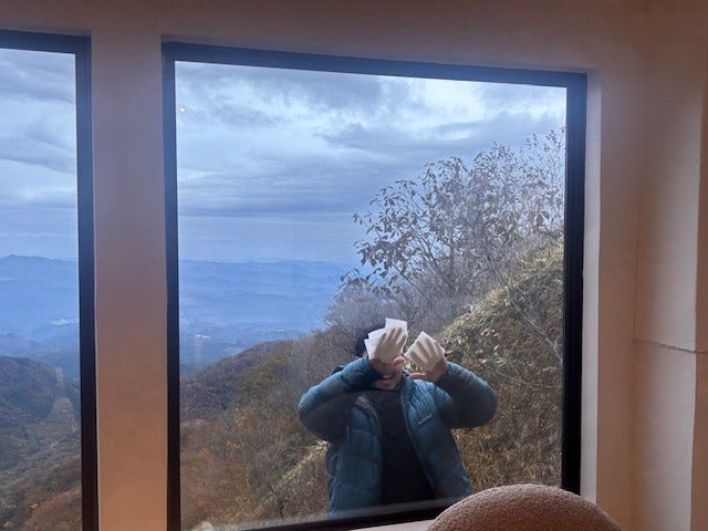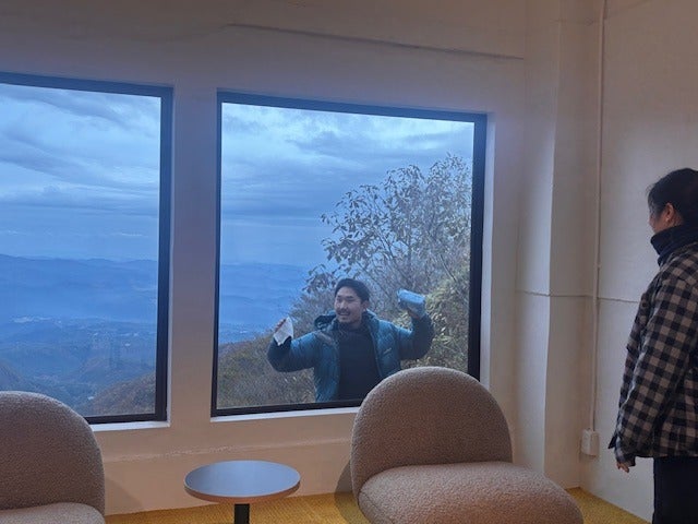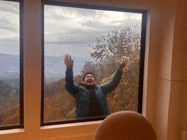 眺望側の大きいガラス窓を掃除中、