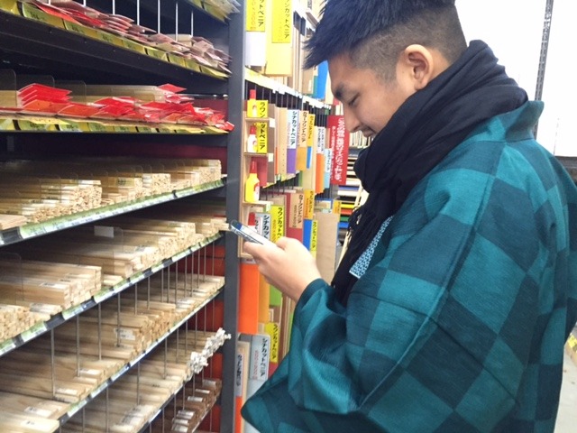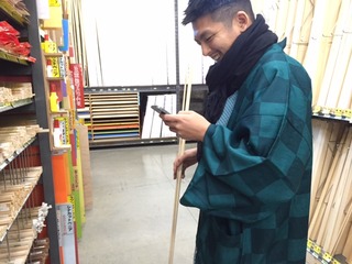 丸い棒と板を持った平本君に