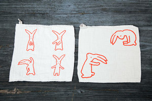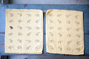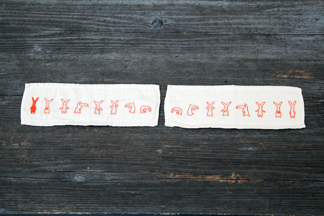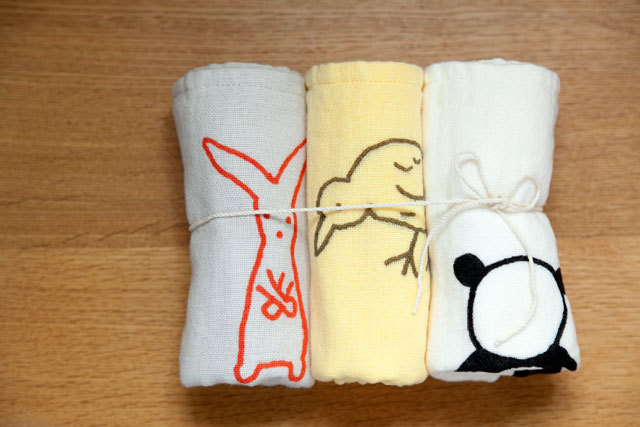 今回の復刻にあたっては、 まえのタオルをお使いのかたも、 あたらしく使われるかたも、 おなじようにたのしみがあるものを、 ということで、デザインを一部変更。 たとえばハンドタオルはわかりやすく、 それぞれのキャラクターの数を かえました。 (右が2010、左が2011です。)