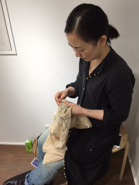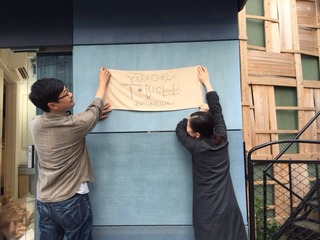 いよいよ、今日から、横尾香央留さんと大原大次郎さんこと、YさんとOさんのTOBICHI。はじまります。写真は昨日の搬入風景。大原さんが、チャコペンで描いたデザインに、ざくざく刺繍していく横尾香央留さん。表に貼り出すポスター、なんと今回は、やさしいタオル製です。