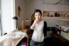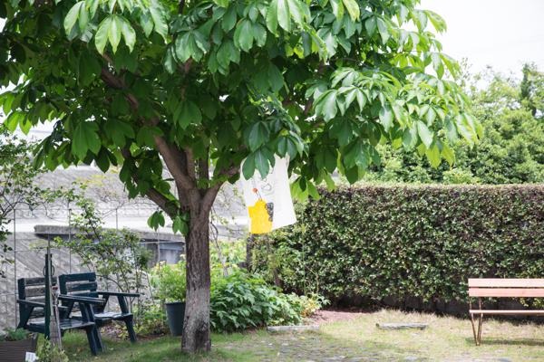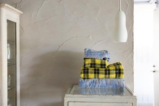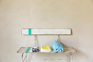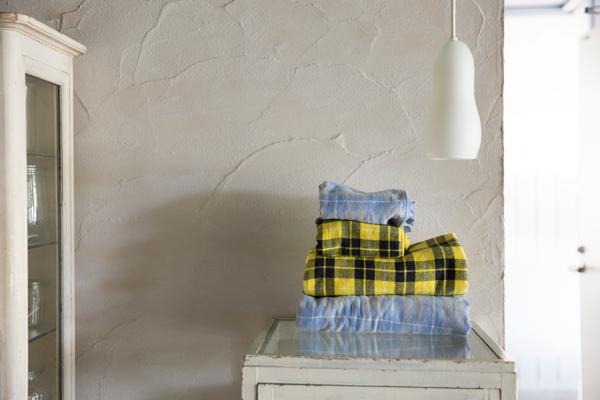「古びた木のイスやドアに やさしいタオルをディスプレイ。 素材が生きています。」