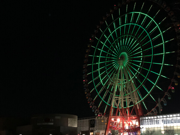 大きな観覧車に照らされながらバス乗り場をさがす。