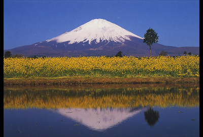 ともに水面に映り込んで、見事な逆さ富士&逆さ菜の花!