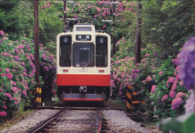 あじさいのトンネルを走っていく箱根登山鉄道。