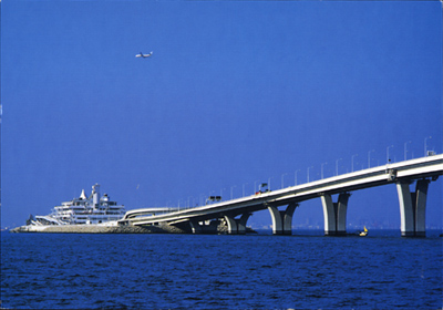 小さく消えていく飛行機と、静かに進む白い船の