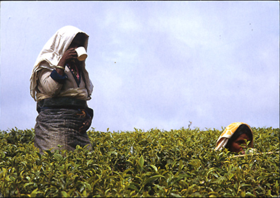 お茶畑でお茶をつむ人がお茶を飲んでいる絵はがき。