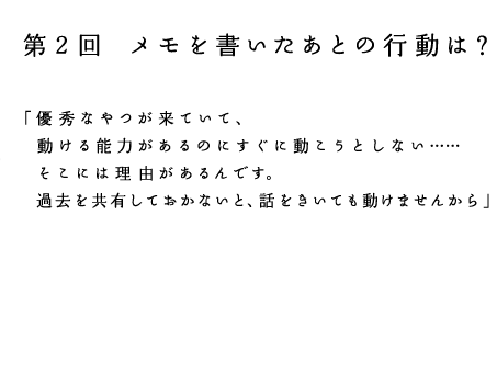 「これはやらなければ!」 と思うことも すべてメモに書きだすんですが、 書いた瞬間に忘れてしまいます…… だから秘書には 「ぼくを動かせ」と言ってあります。