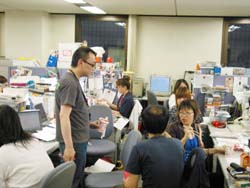 ほぼにちわー。お夜食だけでは飽き足りず、 とうとう週末ランチにも「サルのおせっかい」を デビューさせてしまいました、アロハ・トミタでっす。 忙しくて、コンビニに行く暇さえない方々に 「おせっかい」心まるだして、 はじめたお夜食お届けキャンペーンですが、 先日お届けしたan・an編集部の岩下さんからは 「じつにタイミングのいい時間帯での キャラバン、感謝感謝です。 カップラーメンはわりとよく食べるのですが、 深夜まで入稿したりしているときに、 あったかい汁ものっていうのが、うれしいんですよね〜。 冷たいおにぎりより ずっと健康になれる気がしました。」 というメールをいただき、ルンルン気分になっています。 そして、「まだまだおせっかいをしてしまおう!」と、 次のお届けにくりだしてきたのです。 休日の予定を決めるときや、 好きなアーティストのイベントをチェックするとき、 必ず手に取ってしまう雑誌。 電話帳についで、電話番号が載っている雑誌。 表紙のイラストが誰かすぐにわかると ちょっと得した気分になる雑誌。 そう、「ウィークリーぴあ」の編集部に行ってきました。 今回お邪魔したのは「残業タイム」、 次の号の編集作業で必死に文字を追いかけている時間です。 ぴりぴりした雰囲気が漂っていても おかしくない時間だったのですが、 みなさんとってもあたたかく迎えてくださいました。 これが、な、なんと、 編集部の皆さん全員による拍手のお出迎え。 このノリの良さにはお夜食おとどけ隊も びっくりしましたよっ! あまりのノリの良さに こちらもつられて お夜食を配らせていただきました。 ひとりひとりの席に「サルのおせっかい」を置き、 タイマーを片手に 「あと1分でーす!」 「ピピピ。3分たちましたー。 召し上がってくださーい」 と編集部内に不思議な雰囲気をつくりだしてしまいました。 ![]() まさにそんな時に「ほぼ日」のポストマン宛てに こんなメールが入っていたのです。 「なっ、なんとっ、いまウチの会社に 『サルのおせっかい』がやってきましたよー。 昼頃に社内に出回ったウワサは本当だったー。 ……と、興奮していたワタクシはぴあ編集部のものです。 たくさん、本当にたくさんのラーメンを 持ってきて頂いてありがとうございました。 みんなむさぼるように食していましたよ。 ワタシは前回アッという間に売り切れたときの 『サルのおせっかい』をおすそわけしてもらって 食べていたのですが、すごいおいしくなってる! フタをあけた瞬間に ふわっとガーリックのいい匂いがして、 それだけで食欲がそそられます。 しかもワタシは今日仕事が忙しかったので、 お昼3時とかに食べてるんですよ。 それなのに1個たいらげ……。 あぁ、ニクい。そんなところがとってもニクい。 今度はちゃんと自分で購入して食べますね。 ごちそうさまでした!!」 「興奮冷めやらぬサトウ」さま、 メールありがとうございました! なんとまたうれしいことに、 「ウィークリーぴあ」の6月30日発売号に 「サルのおせっかい」を新製品情報で、 そして7月7日発売号の「今週の客人」コーナーで お夜食おとどけ隊を とりあげていただけることになりました! ![]() 「今週の客人」担当の宮部さんと「新商品」担当の佐藤さん お夜食も落ち着いて、ちょっとゆとりができたとき、 「さーて、どこに行こうかなぁ」と、 思っているみなさま。 「ぴあ」をめくっていた私からのおすすめは、 ぴあ通巻1000号記念イベントとして ラフォーレミュージアム原宿で6月28日〜7月6日で 開催する「希望/HOPE-未来は僕等の手の中」です。 浅野忠信さん、舟越桂さん、北野武さん、荒木経惟さんなど 40名ものアーティストの絵画や写真、立体作品など バラエティー豊かな作品を一同に見ることができるなんて そんなにないですからねっ。 でも。「休みもない!夜食を買いに行く時間もない!」 という方のもとへ、また今週も「お夜食おとどけ隊」が おせっかいに行ってしまうかもしれません。 それではっ! |