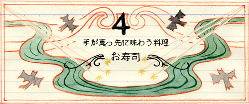 外国の人に「sushi」という料理を説明するとき、 ボクはこういう言葉を良く使います。 「原始的に限りなく近い自然体が生み出す洗練」 そしてそれは日本文化そのものを表現することだ、 とも付け加えます。 畳を床一面に敷き詰める日本の家屋。 雑巾で毎日磨き上げられた 輝くばかりに美しい廊下をもった日本の家屋。 そこで人は靴から解放され、 清潔ですがすがしい生活を享受する。 じゅうたんで飾り立てられた贅沢があるわけじゃありません。 珍しい石で頑丈に敷き固められているわけでもありません。 世界的に見ても不思議な空間、それが日本家屋です。 西洋建築に比べれば、原始的に思えるかもしれない。 なんの工夫も、進化もない、 昔ながらの生活空間のように思われるかもしれない。 でも、あくまで自然をよそおいながら、 しかし自然には絶対に存在しない 「人の手によるおもてなしの気持ち」 が満ち溢れているこの日本家屋を ココロから楽しみたければ、 靴を脱ぎ、素足になってみることが必要でしょう? 日本人は「素」ということを好み、大切に思います。 ですからsushiを食べるとき、 手に何も持たず「素」の状態で 立ち向かうことをお勧めします。 そう言うと、殆どの外国の方は箸を置き、 背筋を伸ばして寿司に手を伸ばします。 寿司は、私達日本人が世界に誇る文化です。 胸を張って間違いありません。 illustration = ポー・ワング |