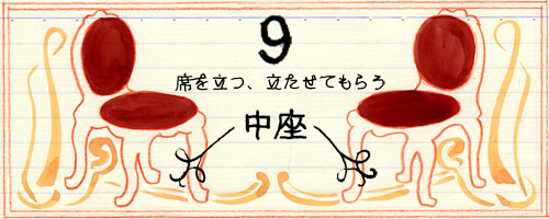 まず中座するとき、テーブルを囲む仲間に一言、 許可をとらなくてはなりません。 これは当然。 ついでお店の人を呼びます。 アイコンタクトでも、 あるいは人差し指をピンと立ててでもかまいません、 サービススタッフに来てもらいます。 そして中座したい旨を伝えて 椅子を引いてもらいましょう。 そうすればその人は厨房にこう報告することが出来る。 「あちらのテーブルのお客様、 今、席を立たれていますので、 調理の進行、しばらくとめて下さいネ。」 ‥‥悪くありません。 中座するときにお店の人を呼んで 椅子を引いてもらうことのメリットはもう一つあります。 営業中のレストラン、テーブルの上は 優雅な時間が流れていますが、 それ以外の場所、厨房の中や通路は まるで戦場のような忙しさ。 本来、人にはお見せできぬほどのドタバタ劇が 繰り広げられています。 でもそんなことを気づかれぬよう、悟られぬよう、 お店の人は精一杯の笑顔と 訓練された身のこなしでがんばっています。 そんな時、あなたが不用意に突然、椅子を引く。 ‥‥どうなるでしょう。 料理を運んでいる人の進路を妨げる。 邪魔になる。 最悪、彼らと衝突をして せっかくの一品を台無しにしてしまう。 ‥‥ようなコトが起こっても不思議ではない。 だから、椅子はお店の人に引いてもらいましょう。