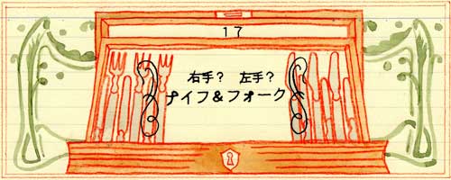 それでもどうしてもナイフとフォーク、 あるいはスプーンとフォークを持ち替えて 食事したくなるような 幸せな食卓に恵まれることもあります。 厨房の中の人に「ごめんなさい」と謝りながら、 それでもどうしてもおしゃべりに 熱中したくなるような場面に遭遇することがあります。 そんなときの注意です。 「ナイフフォークの交換は宙で絶対にしないこと」 友人に「ミスターソーリー」と呼ばれている人がいます。 彼が食卓に並んでいると、必ず一度は事件が起こる。 フォークとかスプーンが食器の上に激突して、 カランカランクワーンと音を立てる。 なぜだか彼の左手のワイングラスが倒れて、 テーブルクロスが真っ赤に染まる。 騒々しい人です。 なんでそんなことが起こるのだろう? と注意してみていると、 彼は頻繁にナイフとフォークを持ち替える。 しかも必ず宙でそれをする。 右手のナイフを左手に持ち替える。 そのとき彼の左手の中には当然、フォークもあって 一度に片手でフォークとナイフを握ることになる。 どちらかをすべり落とす確率はかなりこれで高くなります。 時に彼は、その左手でワイングラスまで握って 場所を移動したりして、 そうなるともう彼は料理を食べている人、 というよりも食卓で不慣れな ジャグリングを披露する人になる。 騒々しい人です。 ナイフとフォークを持ち帰るときには、 必ずお皿の上においてから手を代える。 当たり前のようなことですけれど、 おしゃべりに夢中でそんな当然なことも忘れてしまって テーブルの前でジャグリング。 している人、結構います。 注意しましょう。 あなたがストリートパフォーマーを目指している、 と言うのであれば別ですけれどネ。 illustration = ポー・ワング |