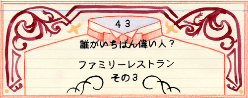 ![]() テーブルに案内されて、ほっと一息。 両手を合わせて両肘ついて、 テーブルの大きさも確認しました。 さあ、これから本格的に食事を楽しみましょう‥‥、 というこの瞬間、一番最初に確かめたいのが 「この店は信頼するに値する店なのかどうか?」 ということでしょう。 どういうお店が信頼に値する店なのか? 答えは簡単。 そのお店を代表する人が活き活きしていて、 ステキな人である店、ということになります。 ビストロとかフランス料理の専門店を選ぶときに、 シェフの人となりがとても重要なポイントになる、 ということを前に言いました。 お店に入って料理を選ぶときにも、 シェフの顔を思い浮かべながら注文すると、 失敗が少ないよ、ということも言いましたよね。 料理が主役の専門店を代表する人はシェフだ、ということ。 でもファミリーレストランの主役は料理じゃない。 料理が美味しいことも大切な要素ですけれど、 どちらかというと料理よりもサービスの良し悪しが 良いファミリーレストランであるかどうか? を判断する大きな要素。 だから、ファミリーレストランを代表しているのは シェフじゃなくて、店長なんです。 だから、まずファミリーレストランに入って テーブルについて落ち着いたら、店長を探しましょう。 店長がどんな表情で、どんなふうに働いているか、 観察してみましょう。
