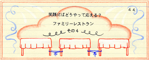 ![]() ファミリーレストランの最大のおもてなしはサービス。 なかでも飛び切りの笑顔が一番のおもてなし、 ということを前回、説明しました。 ステキなファミリーレストランのテーブルに 運良く座ることが出来たあなた。 もうここまでで、いろんな笑顔をもらったはずです。 入り口のところでいらっしゃいませと、お出迎えの笑顔。 テーブルの準備をするために、 少々、お待ちください、と言いながら笑顔。 お待たせしました、ご案内いたします、と元気良く笑顔。 そして客席に案内しながらこぼれるような穏やかな笑顔、 笑顔という笑顔のサービスを もうあなたはたくさんしてもらっているでしょう。 レストランの食事を楽しくする基本は 「何かサービスしてもらったらそのお返しを必ずする」 ということ。 挨拶してもらったら挨拶をし返す。 決して、サービスしてもらいっぱなしにしない、 ということで、 それはファミリーレストランであっても同じことです。 だから笑顔のお返しをしなくちゃいけない。 そのタイミングは、いつがいいのでしょう?