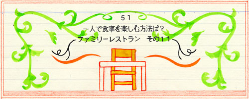 ![]() ファミレスにはいろんなお客様にとっての 楽しみ方が用意されている。 このシリーズの最初の段階で、 そう言うふうに説明しました。 そしてその「いろんなお客様」の中には、 「一人のお客様」が含まれている。 たいていのレストランでは 一人のお客様は歓迎されないことが多い。 一人のお客様が嫌われるのか、というとそうじゃなくて、 実はレストランで働いている人たちは 一人のお客様を楽しませることが苦手なんです。 だから一人のお客様を玄関先に発見すると、 一瞬にして凍りつくほど緊張する。 つまり一人のお客様=「怖い」お客様なんですネ。 誰も自分自身を怖いお客様にはしたくないでしょう?