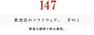 接待にふさわしいレストランのしつらえのコトを、 一方、ハードウェアとしてのレストランではなく、 飲食店のソフトウェアは なので今日は「業種」の話。 まず最初に、野暮な接待と粋な接待の話から。 |