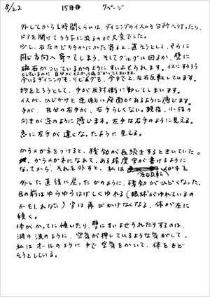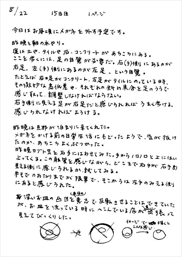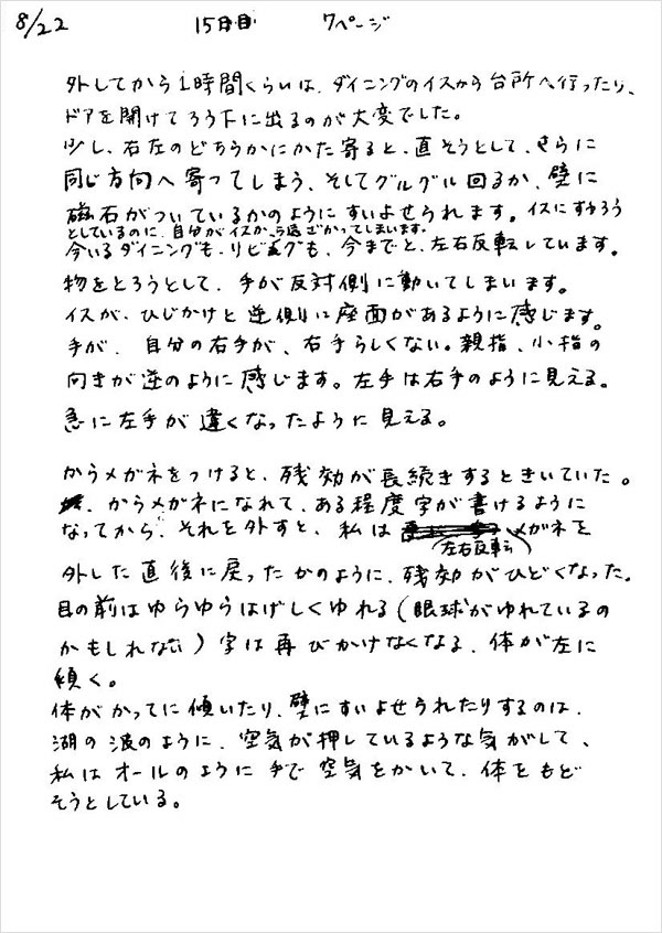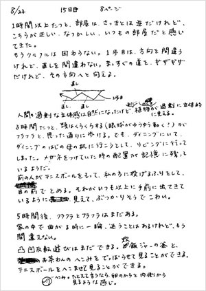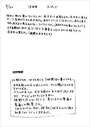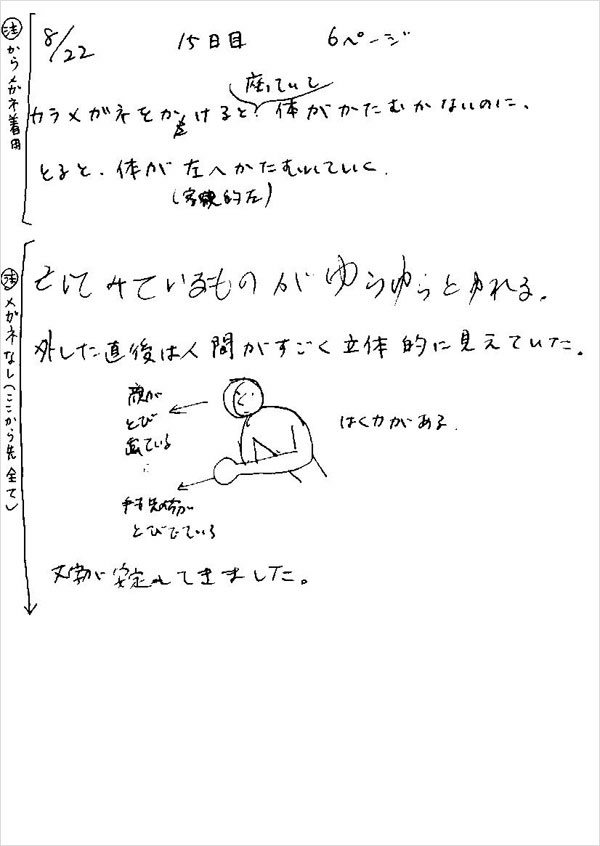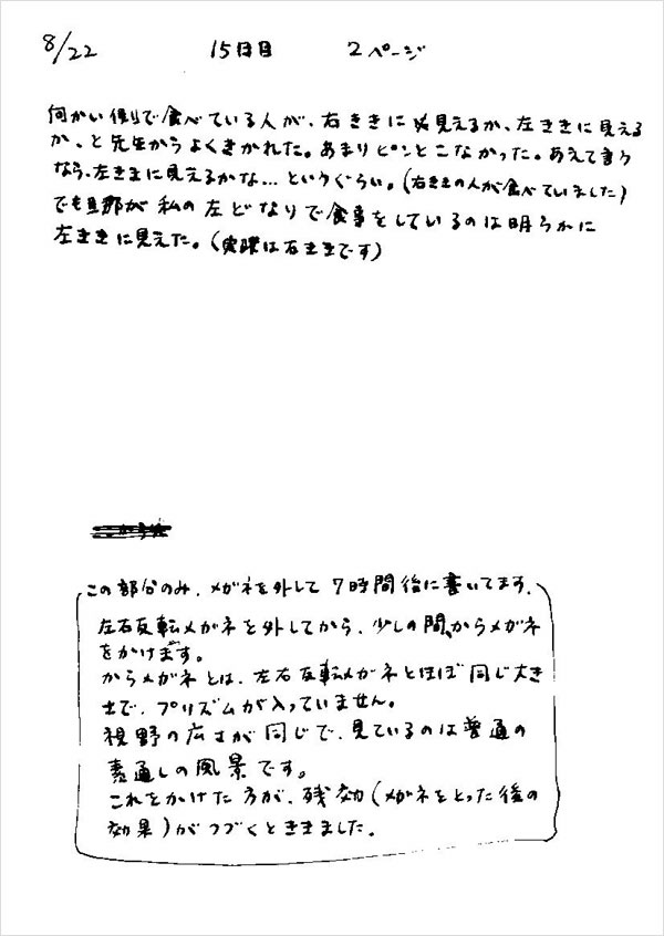 | <この部分のみ、メガネを外して7時間後に書いています。> 左右反転メガネを外してから、少しの間、 “からメガネ”をかけます。 “からメガネ”とは、左右反転メガネと ほぼ同じ大きさで、プリズムが入っていません。 視野の広さが同じで、見ているのは普通の 素通しの風景です。 これをかけた方が、 残効(メガネをとった後の効果)が つづくとききました。 |