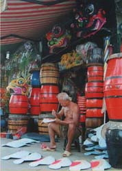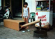 | 54人目 みづえさんの家 (2000年12月24日〜) フジノお姉様のもとを離れ 世田ヶ谷船橋 猫の住む家にきた。 翌朝、国際線でベトナムヘ。 新しい旅の友、みづえさんと、機内ではじめて御挨拶。 みづえ『新世紀は ホーチミンだよ。』 トキキザミ(ロボ)『カウントダウンは僕にまかせて!』 どきどきワクワク嬉しいな!! 以下は、54人目みづえとの旅の記録です。 *** *** ホテルで荷を解いた僕(ロボ)は、街をならそうと、外出。 手ぶらでファングーラオst界隈をぶらついた。 日本人と良く似た顔だが その言葉には不思議なメロディを感じる。 そうだ、僕がベトナムに来ている事を報告しなきゃ。。 インターネットカフェをチェック。 1分1円〜2円が相場。 報告してくれるかと思いきや、新しい旅の友は さっさと屋台に腰掛け、ビールをひっかけている。 僕は一目を引くのか、『小さいのに 一人なの?』と みんなが心配してくれるよ。 『そこの彼女といっしょだよ』と返事しても 聞こえていないみたい。。 欧米人の家族連れが、旅の友に話し掛ける。 『あら一人なの?学生?まぁ一人でビール飲んで。。 (目を細めて笑顔)すいませ〜んこの子に ビールを追加してやって〜』 化粧がはがれちまった上に 変なベトナムわら帽子をかぶってるから 大人の女には見えまへん。 『え、そんな、学生だなんて。。(何年も昔なのに。。) (もう、三十路超しちゃったのよ。おほほ。 先生ったらお言葉がお上手ね) え?すきなビール?? あ、じゃ、コロナ』 (ミ人の金で飲むな〜。お〜い!) 旅を共にすると、相棒の心の声まで聞こえてくるから 不思議だね。 僕の声も届いてるのかな? 『ぷは〜っ。ここだけのはなし、殿方ひとりのばやいは 遠慮するんだべ。。きいてねえか。ういっ。。 緊張してんのかい?ロボ。 カチコチじゃないの、ういっ。。 けっ。だれも声をかけちゃくれない。 きたねえカッコウしてるしなっ。ういっ。』 この先、この酔っぱらいと旅をともにするのか。。 不安な僕、ツーショットで川べりを散歩。 川べりのベンチは、ベトナム人カップルの 濃厚なラブラブワールドで埋め尽くされ、熱気ムンムン。 座るベンチを探してんのか ベトナム人達の熱帯夜(愛撫パラダイス)を覗いてんのか 訳わかんなくなってる旅の友は 結局僕をかなり上流まで連れて来た。(約1km) 『日本より、ラテンだべ。どうするべ?このまま 引返すべか?』と、すわった目つきで僕に問う。。 『僕の金属の身体、ラブビームにアタックされて なんか変。なんか変なの。。』と僕。 『じゃぁ 休んでく?』 女なのに、男のように言い放つ旅の友。 (やすんでく??)。。 僕が旅をはじめて約2年、何度となく聞いた台詞だ。。 (うん。。やすみたい。。) 『お〜〜〜〜い!!どこで休ませるんだよぅ〜!!』 ![]() 夜のサイゴンを、船にてサイトクルージング。。 船長さんの手の中で、僕はもう、夢の中。。 ***** ****** 戦争証跡博物館で、日本人写真家『石川文洋』と ロバートキャパの、戦争記録写真をたくさん見る。 中庭には、武器や戦闘機が、ごろごろ並べられていた。 ![]() 写真のショックで、その夜、悪夢にうなされる。。 一夜にして、日本が侵略される夢だ。 森へひとり逃げていた僕は 後方から一人の男に捕らえられる。日本人?? 口を押さえられ、銃口をこめかみに当てられる。 『*** ※※*』知らない言葉なのに 『騒ぐな』と言ってるのが解る。 夢の中で『夢であってほしい。。』と泣きそうになる。 身体が震えて、自分の歯がカチカチ音をたてる その振動で目がさめた。 旅の友の静かな寝息。。 不思議だな。 いつかどこかで、こんなふうに 恐怖に震えた過去があるような。。 夢の中で経験したから きっと、記憶が錯覚をおこしたんだ。。 そう思う事にして 目を閉じようとしたけど 結局、空が白みはじめる頃まで 奇妙な緊張は、解けなかった。 *** *** 『ロボ、まだショックがとけないの??』 心配そうに僕を覗き込んだ旅の友は 『美味しいものでもたべて、リラックスしましょうね』と 僕をなぐさめてくれた。。 『わ〜〜 美味しそう!!』 ![]() 今日の食卓には、日本人男子が3人加わり、豪快に注文。 やっほ〜!! 喜ぶのも束の間、この後僕は、蛇、ネズミ、田螺などの ゲテ物を口にする事になる。。 サバイバルライフを強いられても 生き残る可能性が見えた気がする、 そんな、神妙な味でした。。 (結局、犬はたべられず仕舞いだったよ) *** *** 20世紀最後の夜は、 物凄い数のバイクびとが道を埋め尽くし、まるで、 祭を妨害するために集結した暴走族のようだった。。 そのうち、その数が膨大に増え続け、走行不可となり 歩行者天国になりました。 おそるべし。ベトナムバイク社会。 (いちばんすごいので5ケツを見ました!! ノンヘルは当たり前) ホテルのテレビで、各国の様子をしばし観賞。 どの国も、世紀の瞬間を目前に盛り上がってますなぁ。 時差が2時間あるので、 紅白歌合戦は10時位に終わったらしい。 『カウントダウンに参加しちゃったりなんかする??』と 21